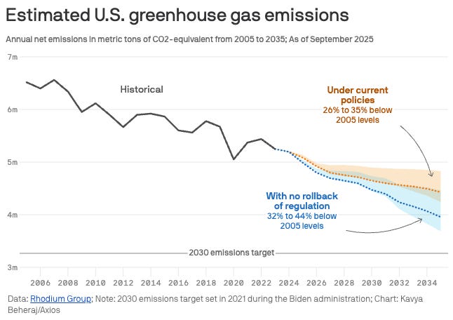 The big picture: America’s emissions are projected to decline substantially even if major climate regulations are repealed, driven by falling renewable energy prices and cleaner natural gas outcompeting dirtier coal.