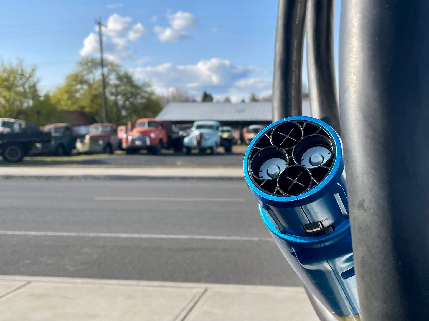 This is a charging station contrasted with old trucks in my tiny hometown of Sprague, WA. I was visiting home last weekend and find the contrast between old and new quite striking in rural parts of our country.